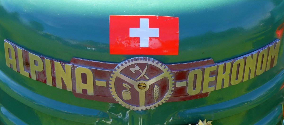 ALPINA OEKONOM, Schriftzug am Kühler eines Ackerschleppers Baujahr 1953, die Firma Hoegger in Gossau/Schweiz baute die Traktoren mit luftgekühlten Benzinmotoren von Wisconsin, Juli 2015
