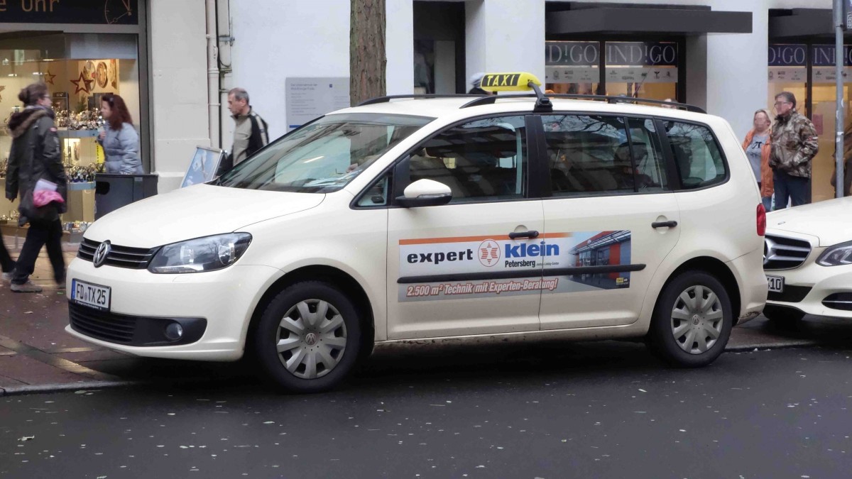 VW Touran ist als Werbeträger für "Expert Klein" in Fulda unterwegs, Dezember 2015