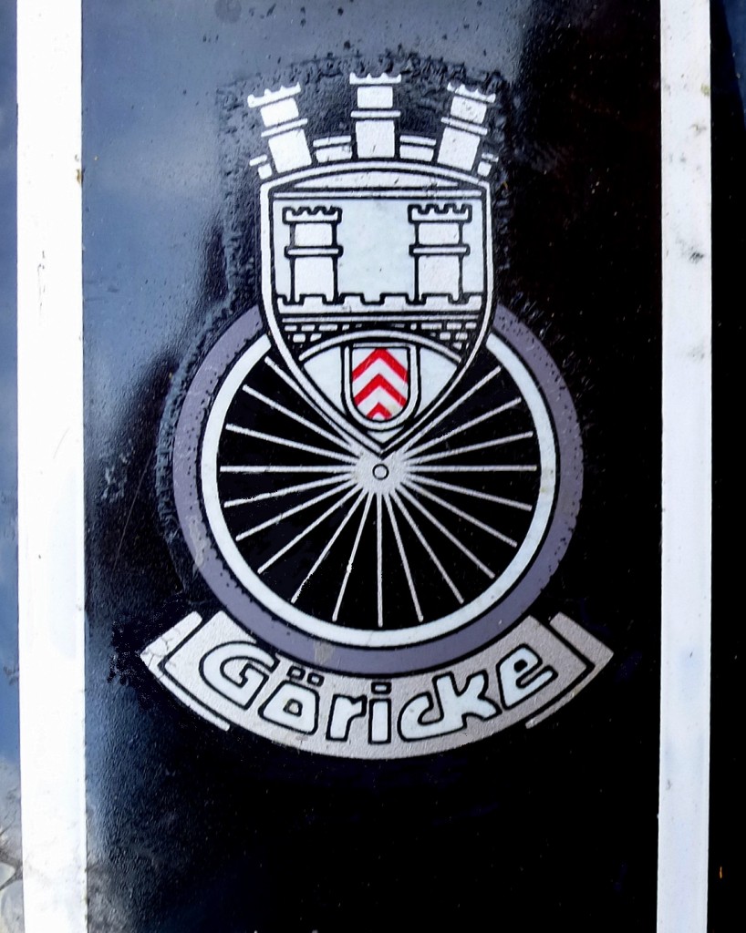 Görickewerke Bielefeld, Firmenemblem auf dem Hinterradschutzblech eines Oldimer-Motorrades von 1950, die Firma bestand von 1903-69, Feb.2015