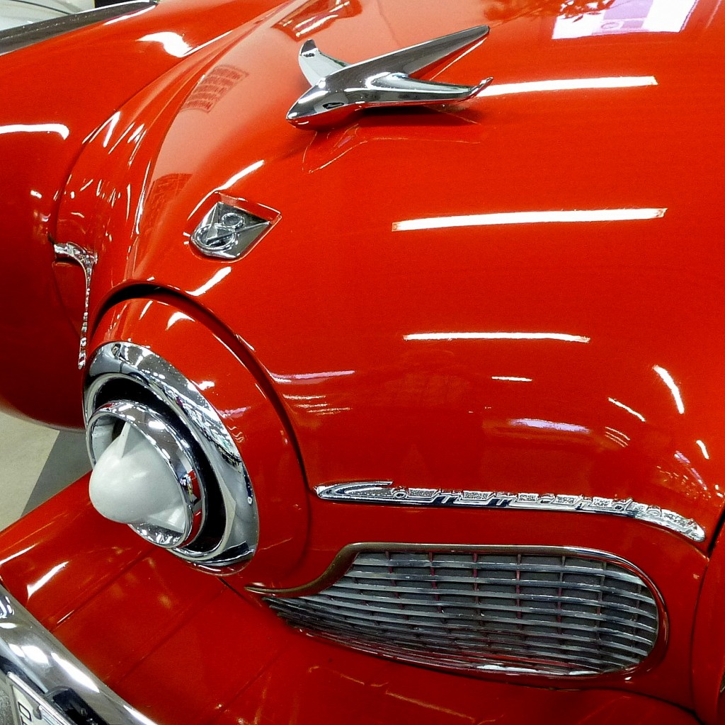 Studebaker Corporation, Kühlerfront mit Logo und Kühlerfigur am Oldtimer-PKW "Commander" von 1951, Feb.2015