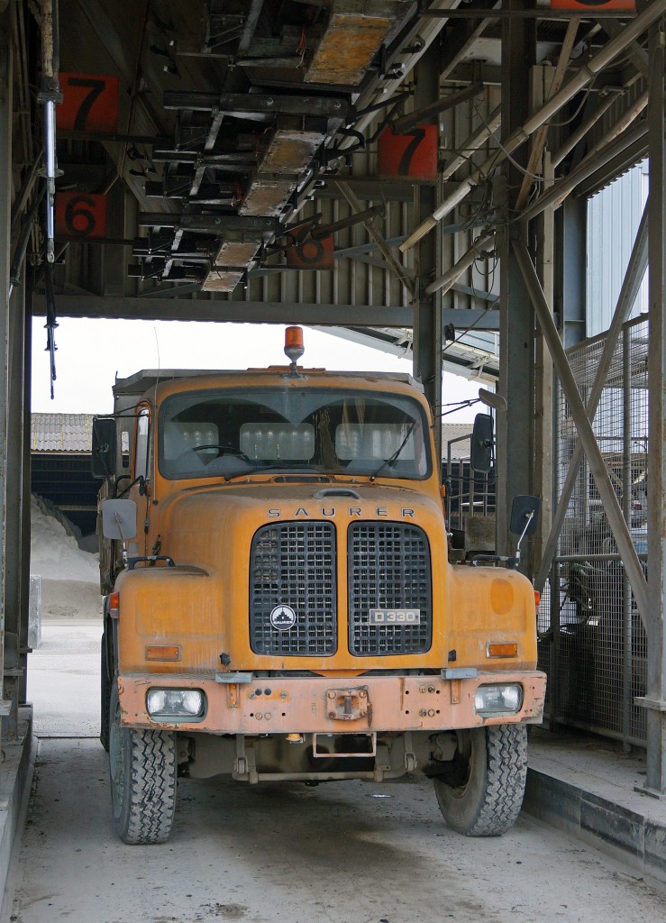 SAURER: SAURER D 330 Kipper noch im alltäglichen Kiesverkehr in einer Kiesgrube bei Niederbipp im Einsatz. Die Aufnahme ist am 16. Januar 2015 entstanden.