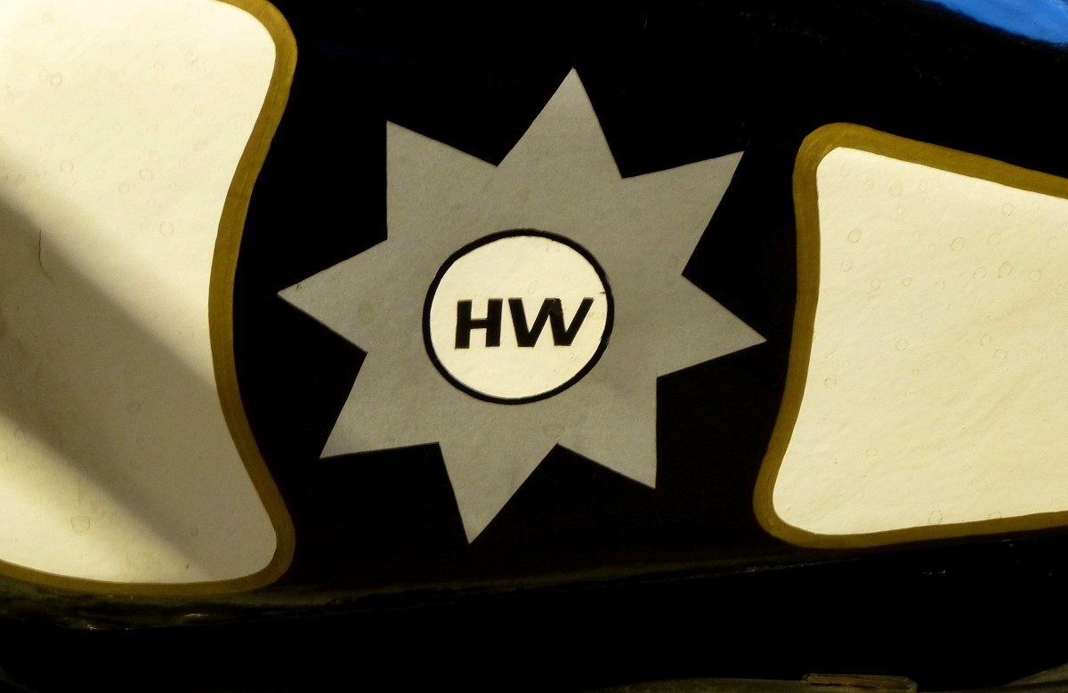 Meister-Werke Erhard Doppelt Bielefeld, adäquat zu Kühlerfiguren bei PKW und LKW gab es früher diese Figuren/Logos auf den Vorderradschutzblechen von Zweiradfahrzeugen, hier an einem Kleinroller von 1955, Jan.2015