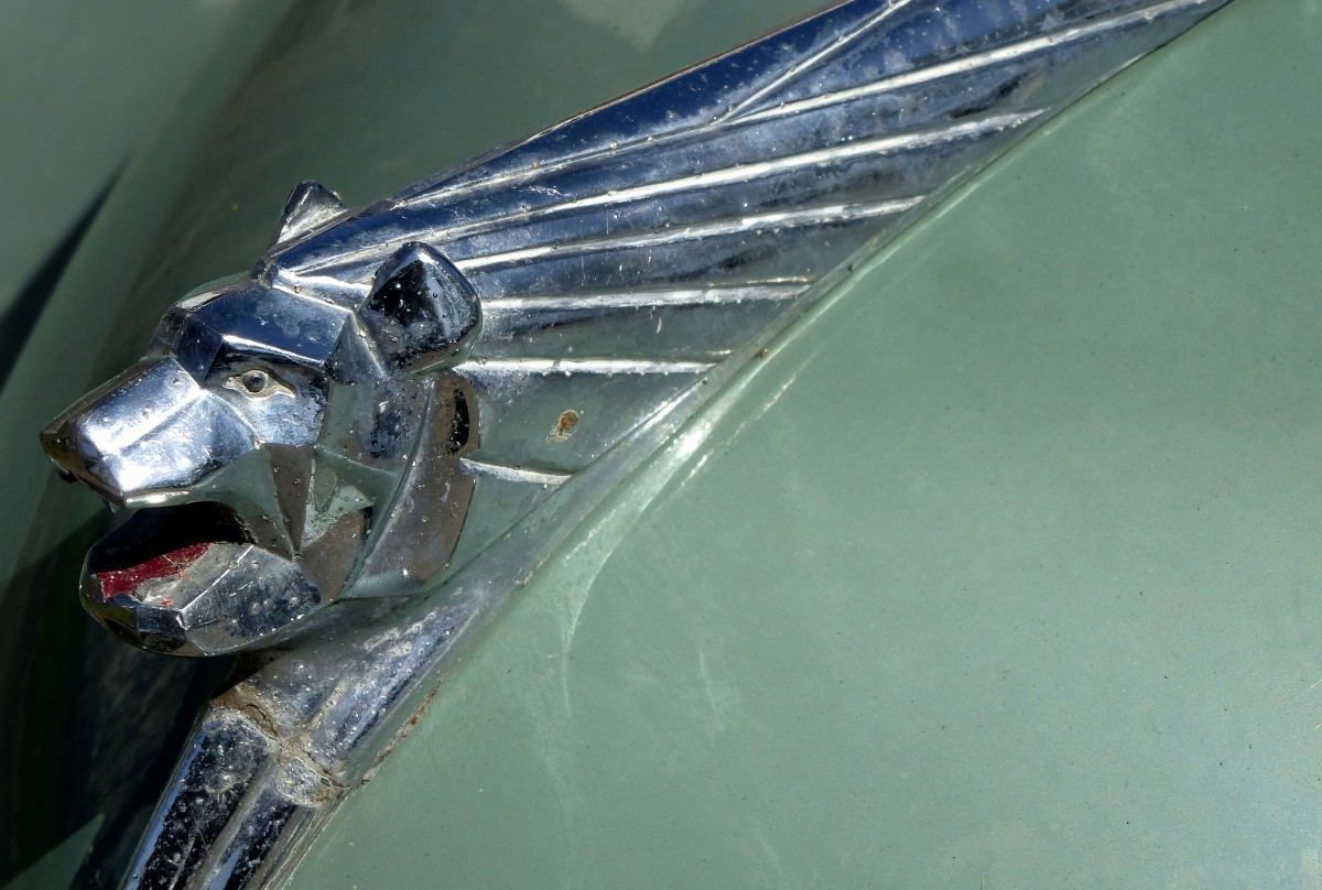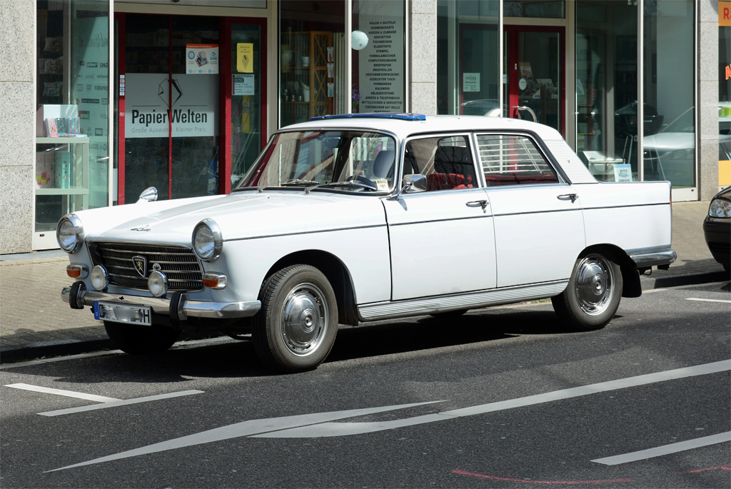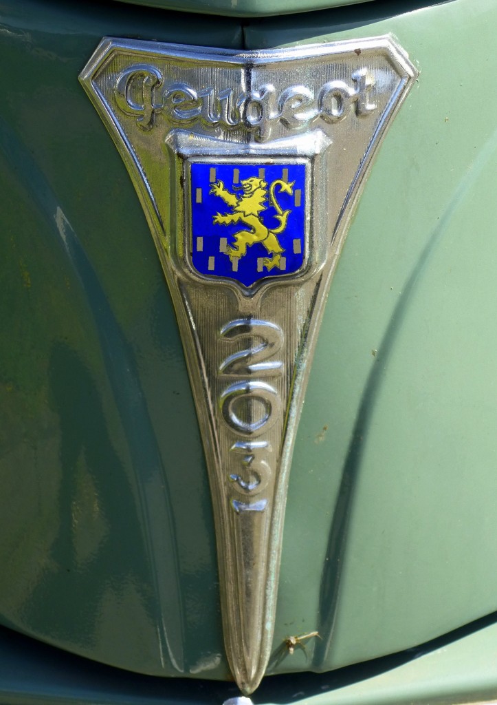 Peugeot, Kühleraufschrift und Emblem an einem PKW Typ 203, April 2015