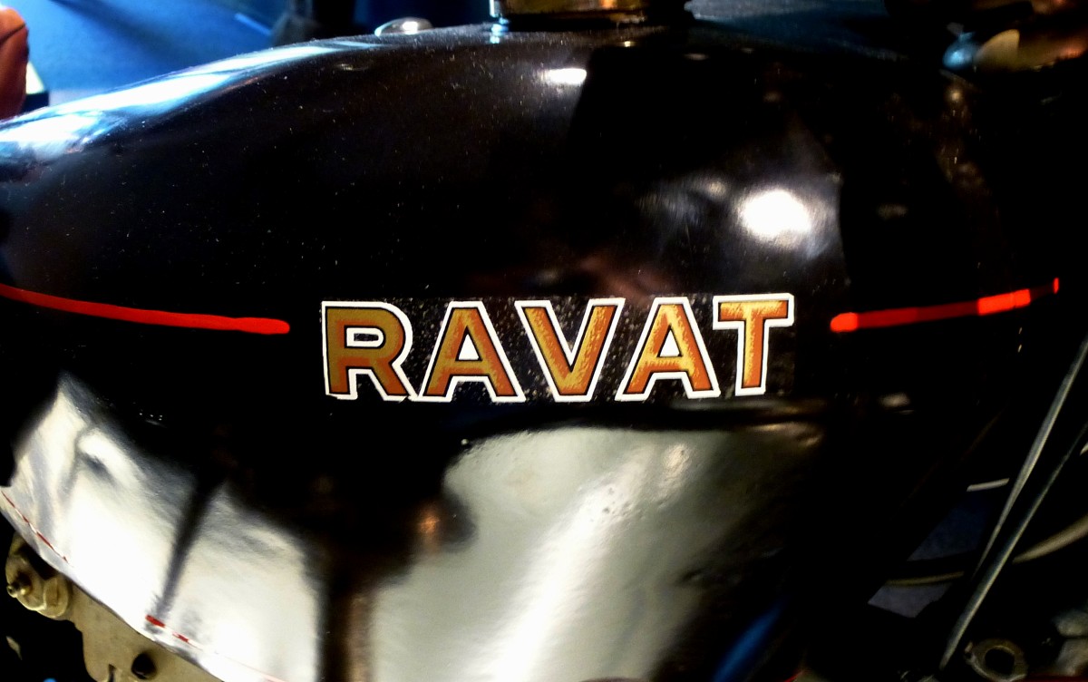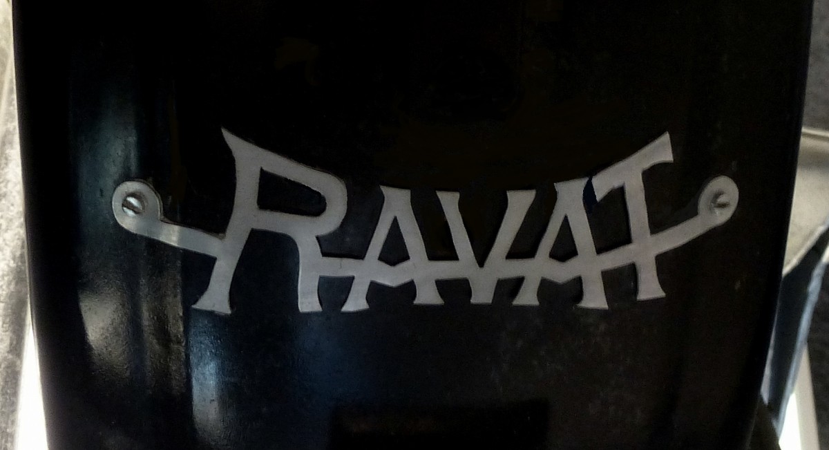Ravat, Schriftzug am Hinterradschutzblech eines Oldtimer-Motorrades von 1929, April 2015