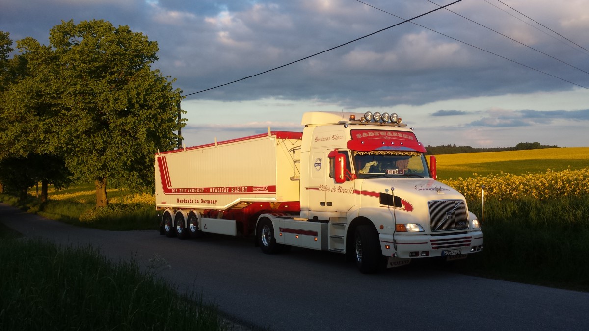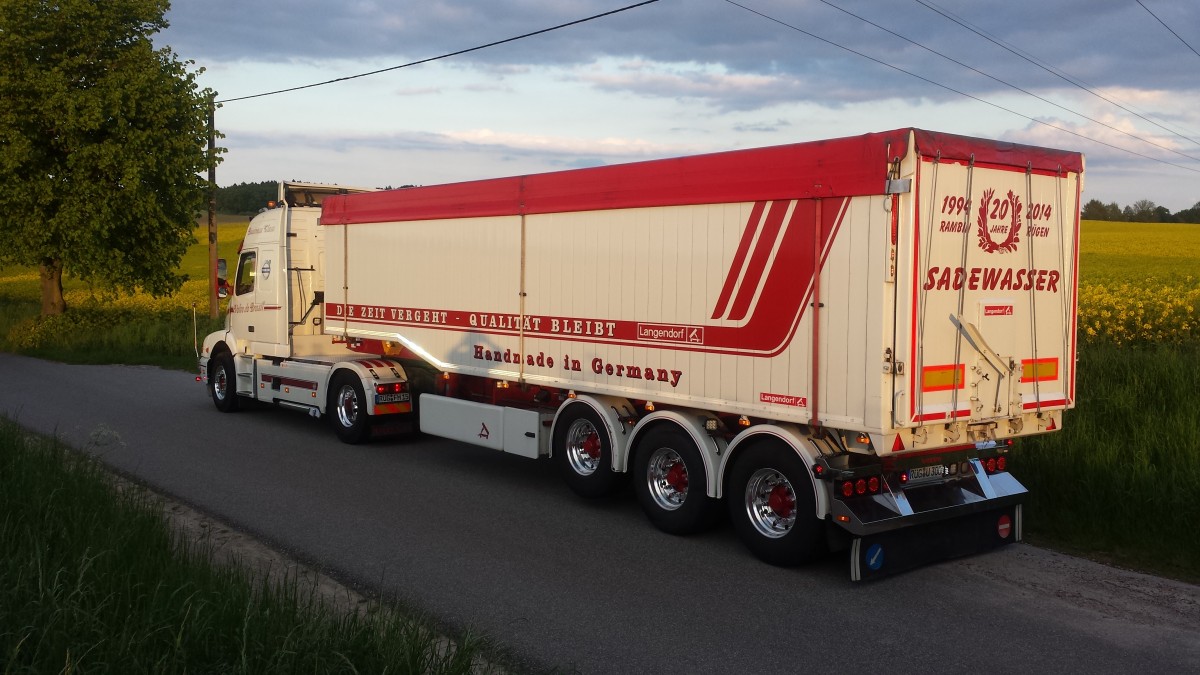 Volvo NH12 4X2T 460 mit einem Langendorf Kippsattel in der Abendsonne am Rapsfeld bei der Ortschaft Alt Kätwin am 21.05.2015 . Der Langendorf Kippsattel wurde mit einem Edelstahl Unterfahrschutz und komplett mit LED Leuchten von der Fa. B u. K aus Barsbüttel aufgewertet.