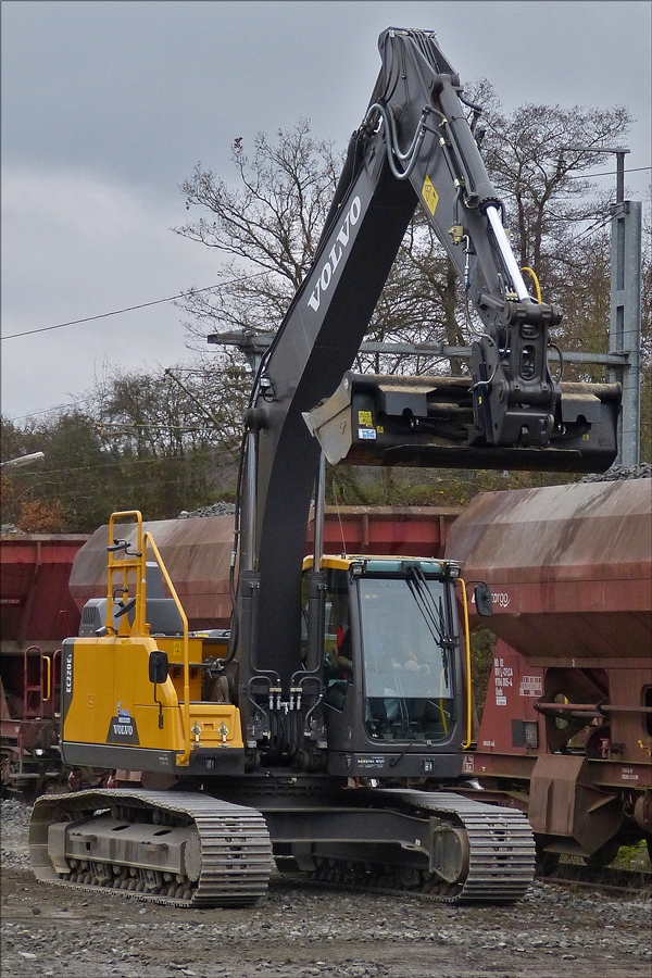 . Volvo EC 220 EL Raupenbagger beim beladen von Eisenbahnwagen mit Schotter, besehen am 07.11.2015.