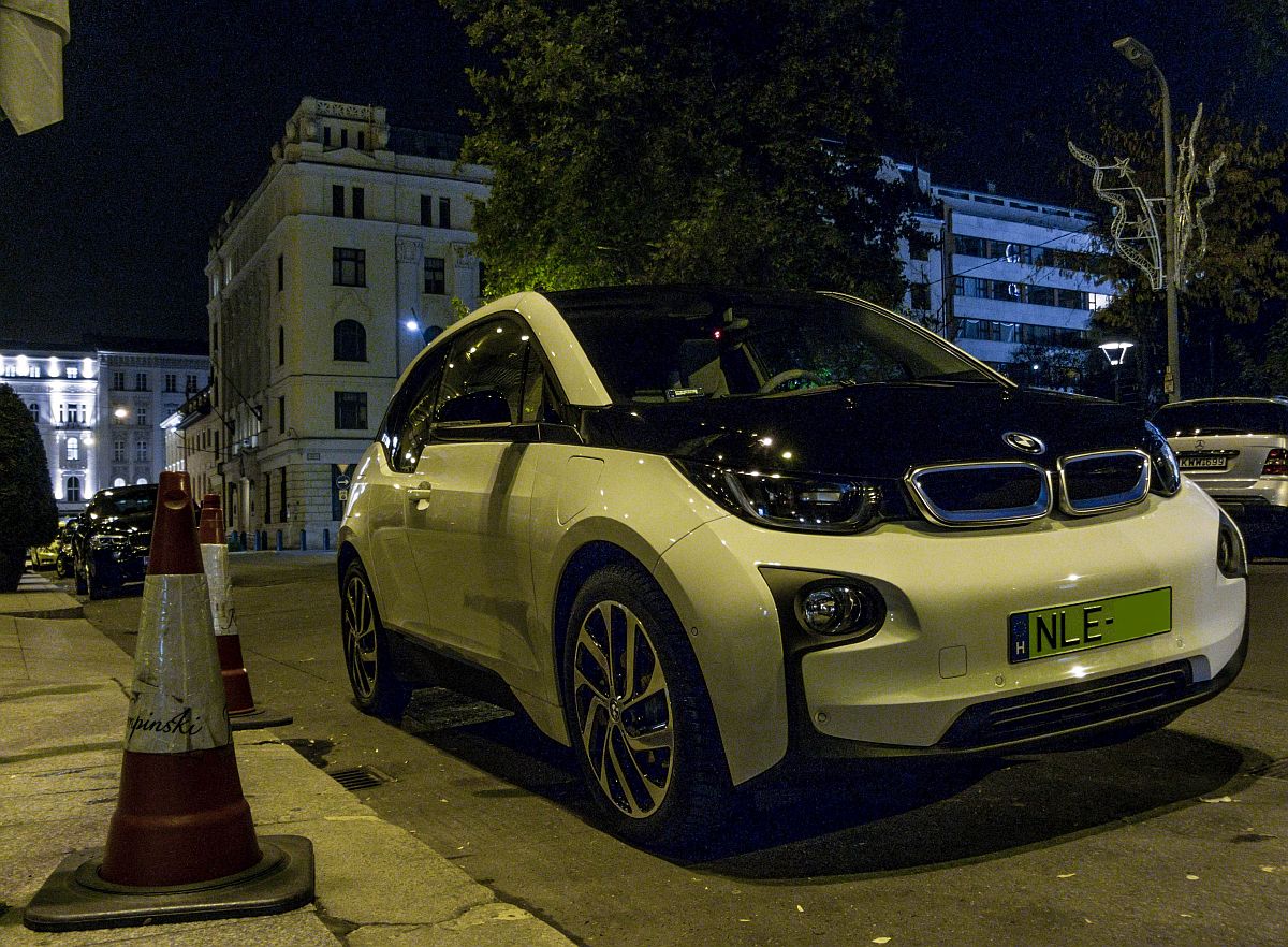 BMW i3, gesehen am 29.10.2015. In Ungarn dürfen Elektroautos und Plug-in Hybrid Fahrzeuge nach einer Gesetzänderung grünes Kennezichen tragen.