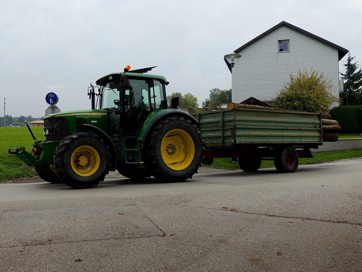 John Deere-6320 mit Einachshänger und einer Ladung Rundholzstämme; 151019