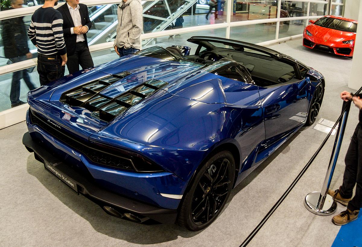 Lamborghini Huracan Spider (Rückansicht), fotografiert auf dem Auto Zürich (November 2016).