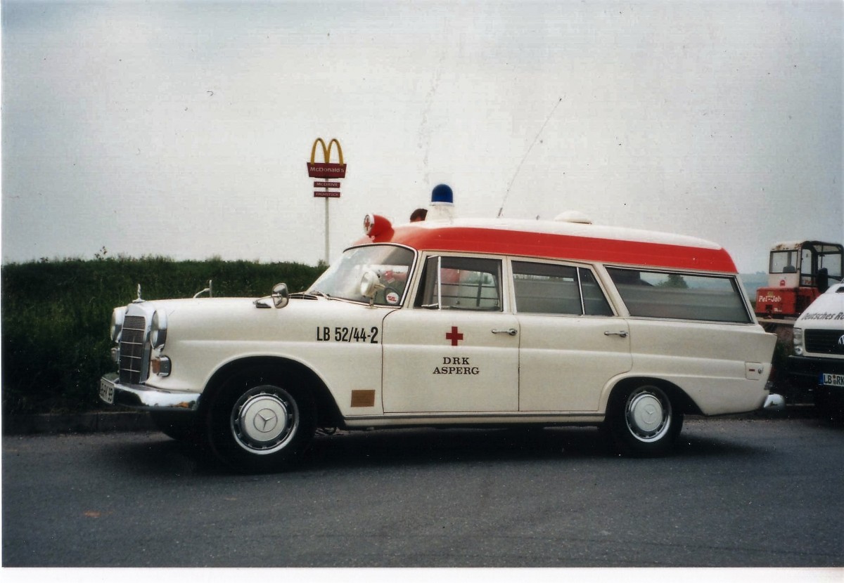 Mercedes-Benz 190C - Baujahr 1964 als KTW-Oldtimer des DRK Asperg. Die Aufnahme entstand im Juni 2001 auf einem Autobahnparkplatz in Thüringen.