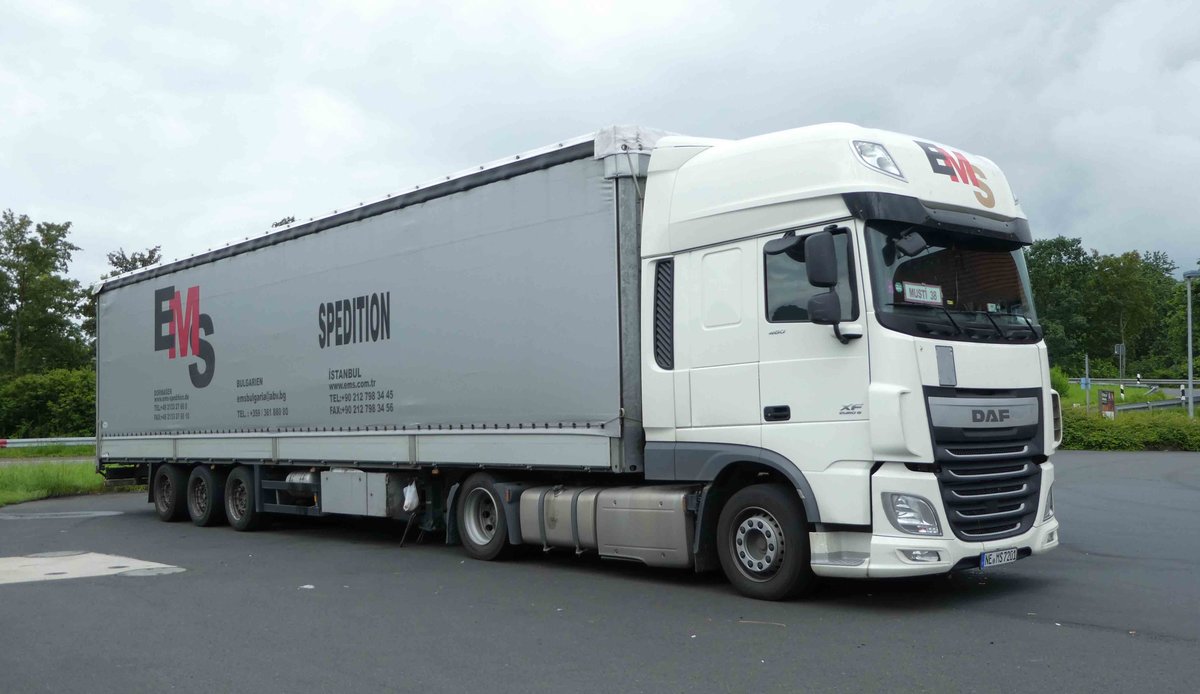 DAF XF der Spedition "EMS" rastet am Autohof Fulda Nord im Juni 2016