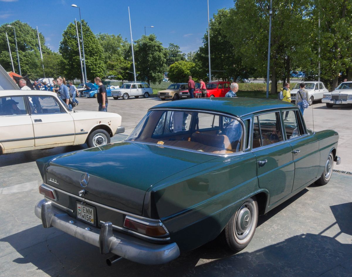 350 SE ist mit einem V8-motor, der aus 3499 cm³ Hubraum 200 PS leistet, motorisiert. Oldtimertreffen an der "Alten Dreherei" in Mülheim an der Ruhr am 18.06.2016.