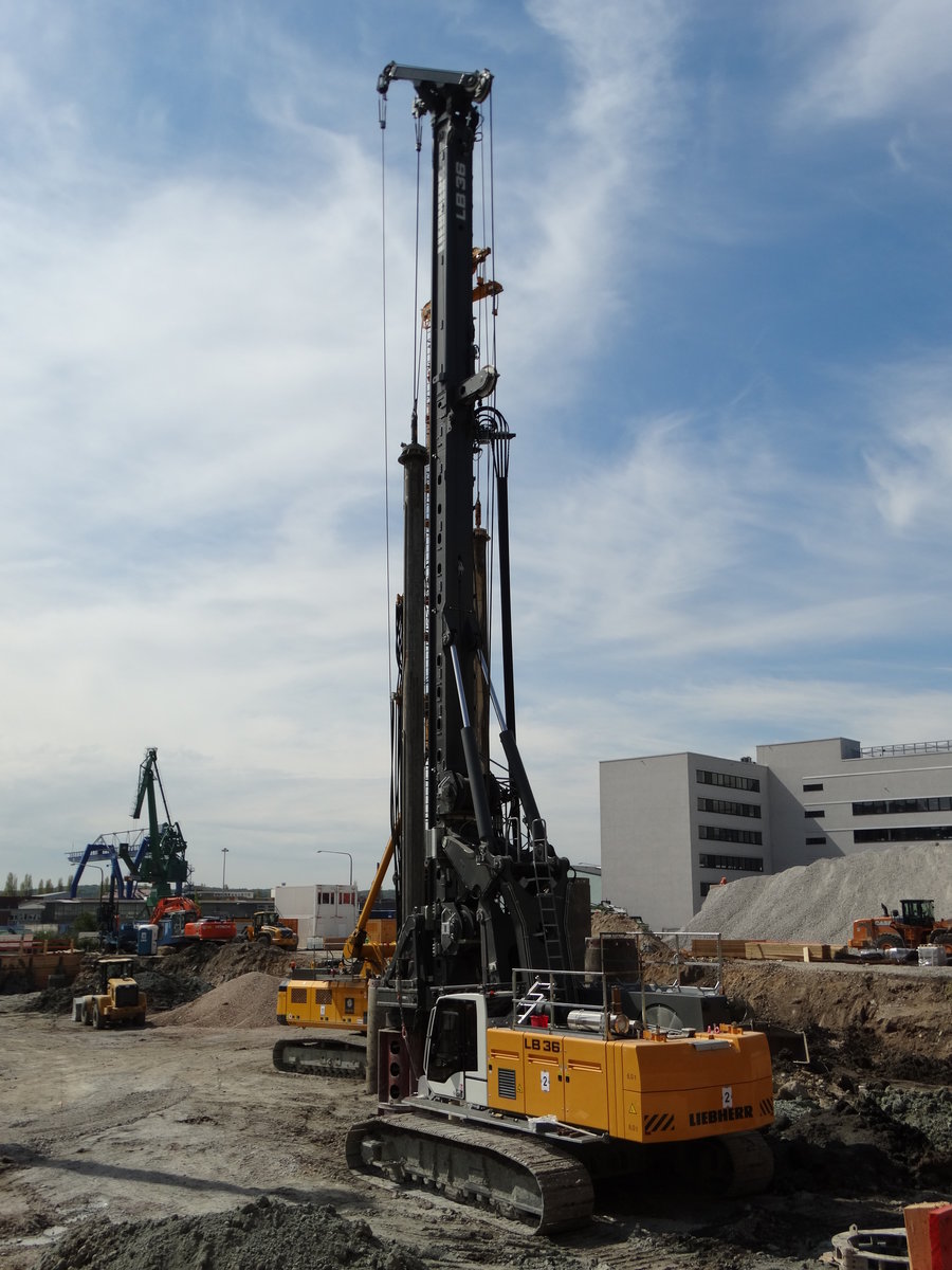 LIEBHERR LB 36 Großdrehbohrer am 30.04.16 auf einer Baustelle in Frankfurt am Main durch den Bauzaun fotografiert