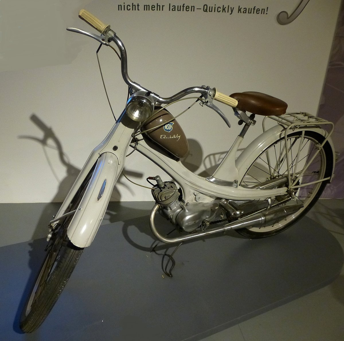 NSU Quick, erfolgreiches Leichtmotorrad, von 1936-53 wurden über 300 000 Stück gebaut, 1-Zyl.2-Taktmotor mit 97ccm und 3PS, Vmax.55Km/h, NSU-Museum, Sept.2014