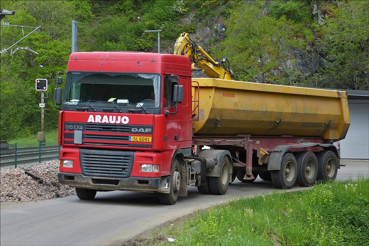 . Am 17.05.2016 fährt diesr DAF 95 XF Sattelzug eine Großbaustelle an um dort mit Schotter beladen zu werden.