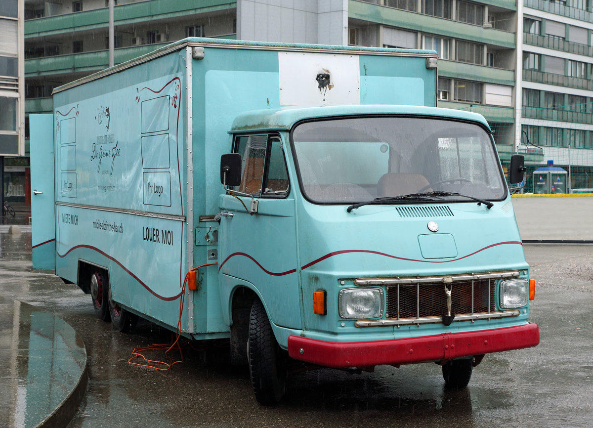 OPEL BLITZ: Am 13. Mai 2016 in der Solothurner Vorstadt unterwegs war mit der "GRÜNEN FEE" ein sehr selten gewordener OPEL BLITZ Kleinlaster mit dem Aufbau einer BAR.