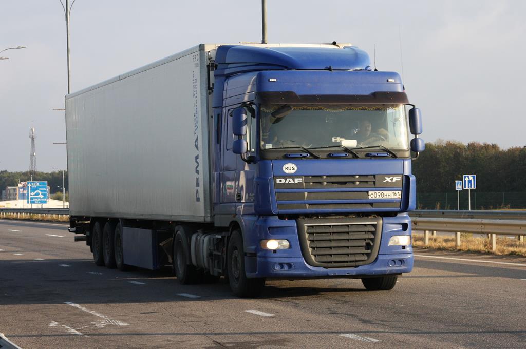 DAF XF Sattelzug auf Autobahn bei Uman in Richtung Odessa am 10.10.2016.