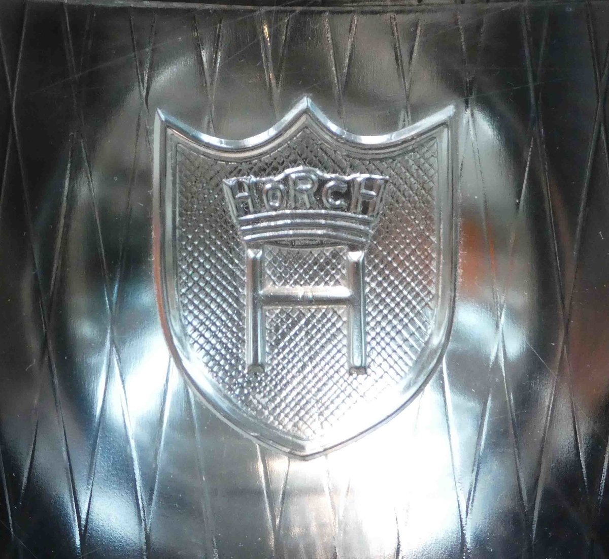 =Horch-Logo im Scheinwerferglas des Horch 375 Pullmann, Bj. 1930, 3950 ccm, 80 PS, gesehen im August Horch Museum Zwickau, Juli 2016.