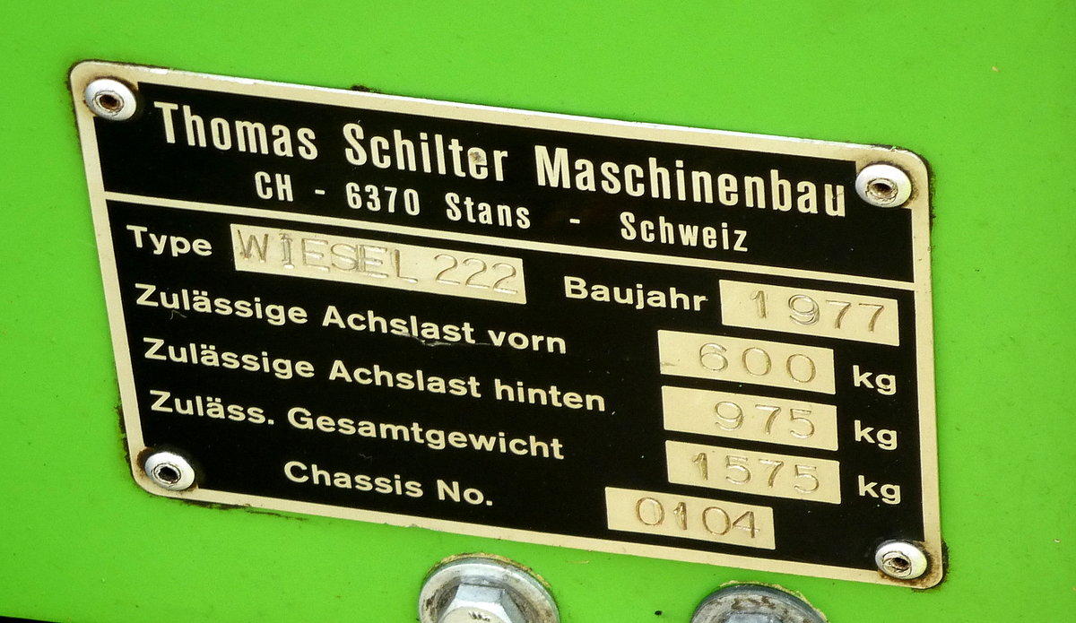 Thomas Schilter Maschinenbau in Stans/Schweiz, Typenschild an einem Traktor von 1977, Okt.2016