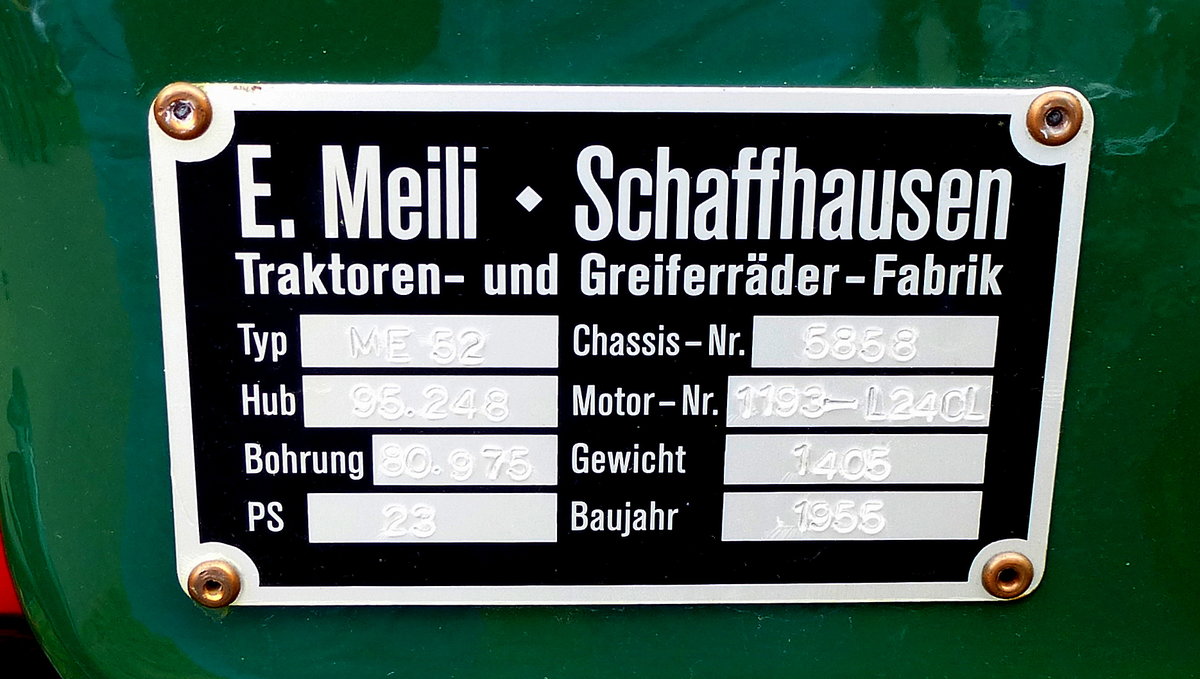 E.Meilli, Firmemschild an einem Oldtimer-Traktor von 1955, die Firma in Schaffhausen/Schweiz bestand von den 1930er bis in die 1960er Jahre, Sept.2016