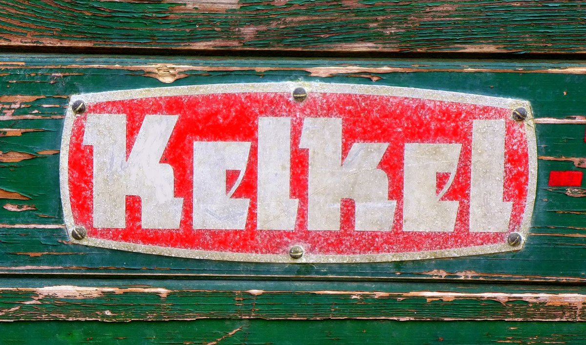 Kelkel, Schriftzug an einem betagten Zweiachsanhänger, die Firma wurde 1933 in Baden-Württemberg gegründet und baute Traktoren und Anhänger, Sept.2016
