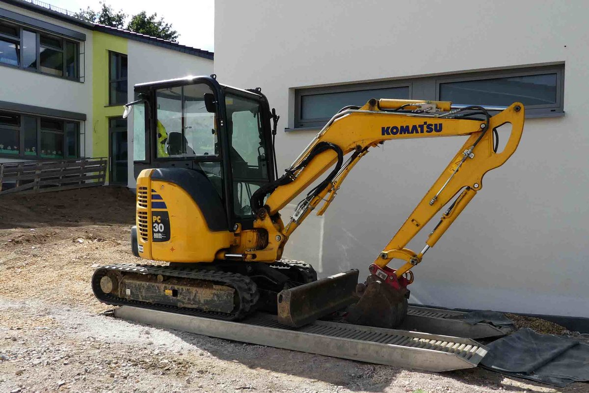 =Komatsu PC 30 steht an der Silberbachschule in Taunusstein im August 2016