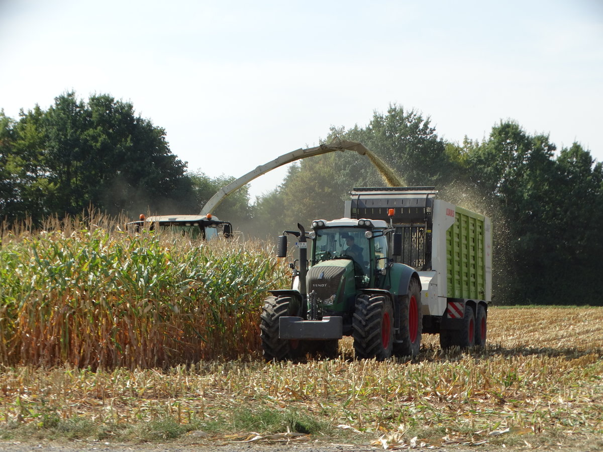 Lohnunternehmen Mäser Claas Jaguar 950 und Fendt Vario 828 mit Claas Cargos 9500 beim Mais Ernten am 15.09.16 in der Nähe von Altenstadt (Hessen)