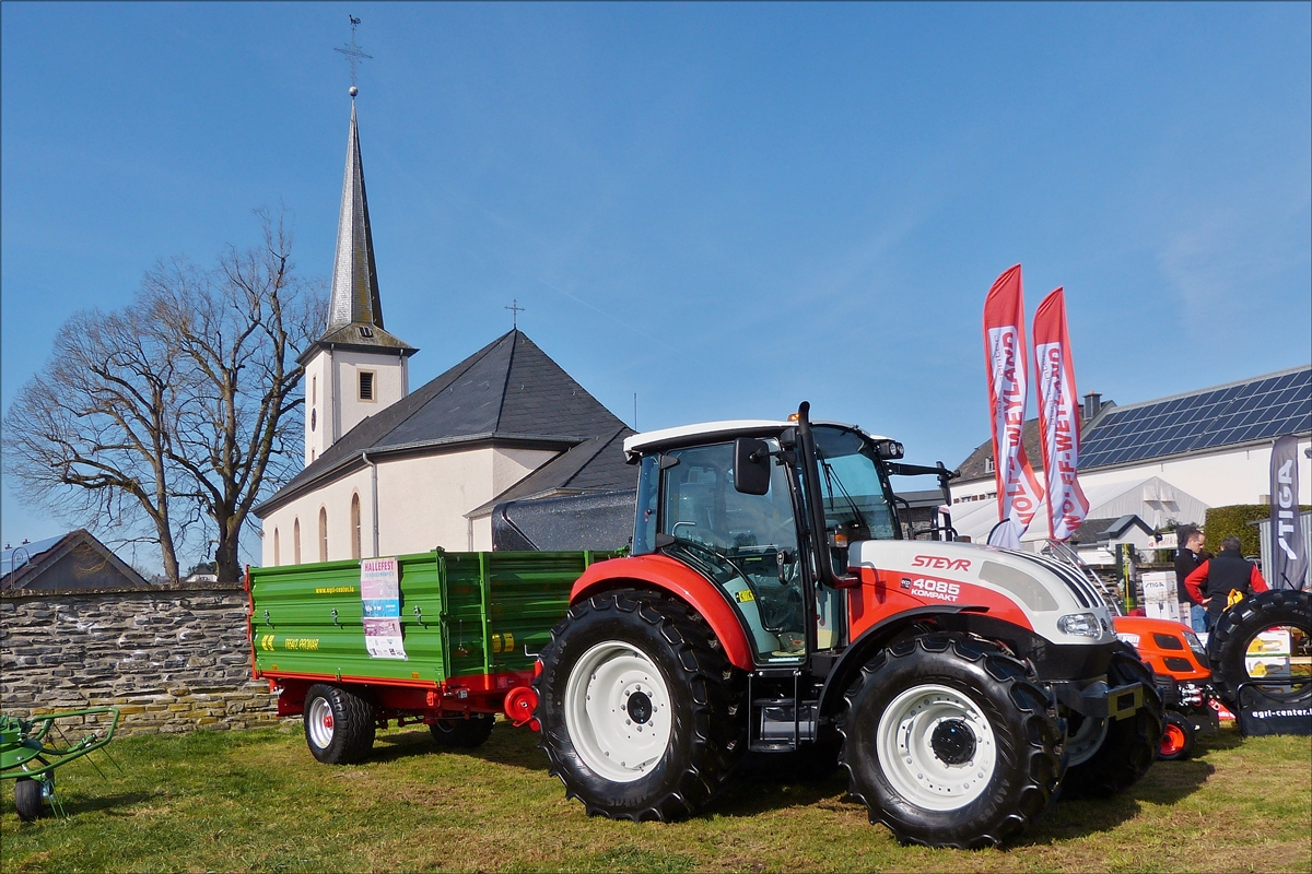 VALTRA-6200 samt kleinem Viehtransportanhänger, ist bis zum Anschlag an die Absperrungsgitter aufgrund der knappen Parkplatzsituation herangefahren;170404