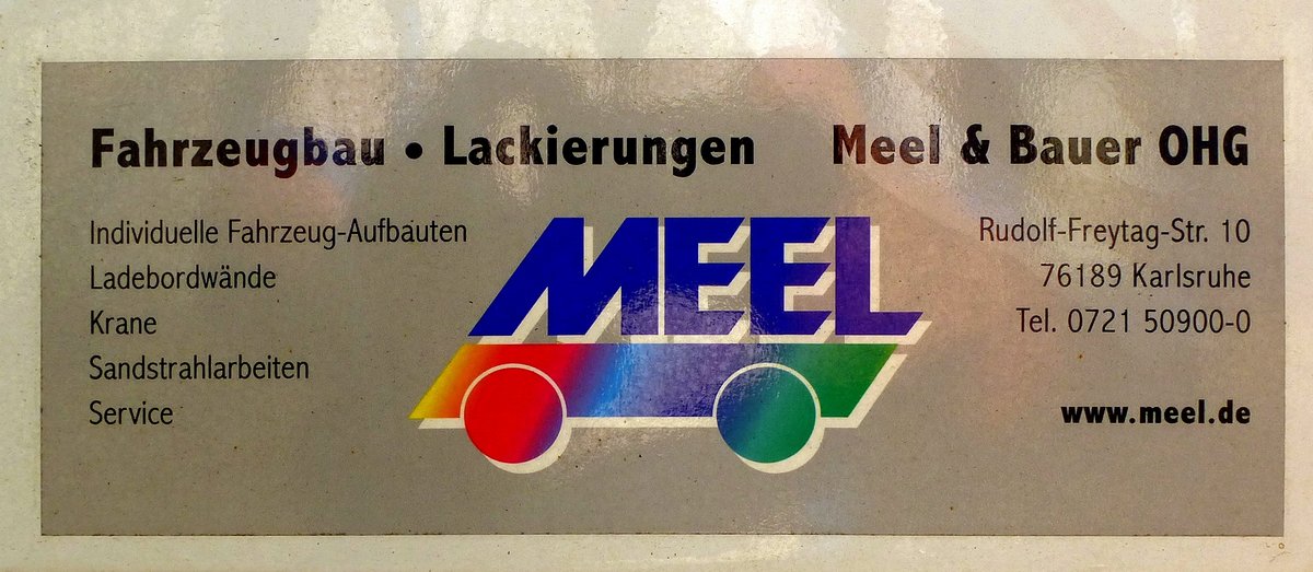 MEEL, Firmenschild an einem LKW-Anhänger, Fahrzeugbaufirma aus Karlsruhe, Aug.2017