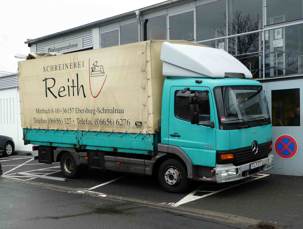 =MB Atego der Schreinerei "REITH" steht auf einer Baustelle in Fulda, 02-2017
