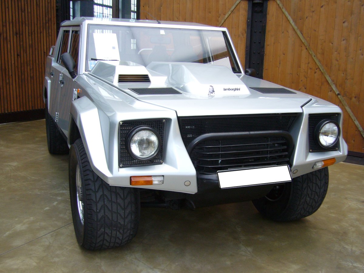 Einer von 301 produzierten Lamborghini LM002. Dieser SUV wurde von 1986 - 1993 produziert. Der V12-motor hat einen Hubraum von 5167 cm³ und leistet 455 PS. Laut zeitgenössischen Testberichten kann der LM002 bei forscher Fahrweise schon mal 40 Liter auf 100 km verbrauchen. Classic Remise Düsseldorf am 26.02.2017.