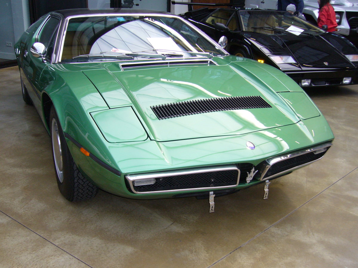 Maserati Bora. 1972 - 1978. Der Bora war der erste Straßensportwagen aus Modena mit Mittelmotor. Wie bei Maserati damals üblich war auch der Bora nach einem am Mittelmeer beheimateten Fallwind benannt. Der im Farbton verde indy lackierte Wagen hat einen V8-motor, der aus einem Hubraum von 4930 cm³ 332 leistet. Classic Remise Düsseldorf am 26.02.2017.