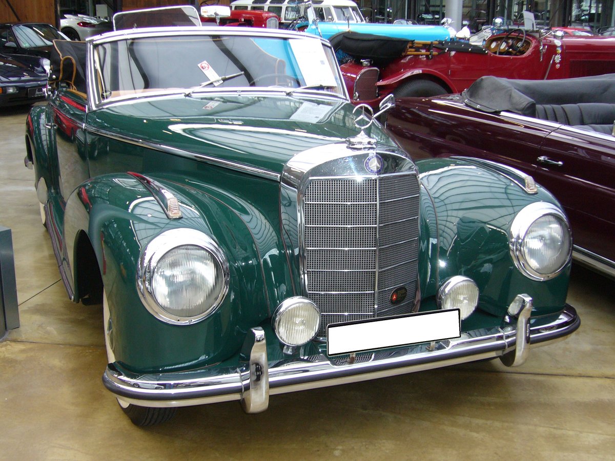 Mercedes Benz W188 I Cabriolet. 1951 - 1955. Beim W188 handelt es sich um das Cabriolet bzw. Coupe auf der Basis des "Adenauer" Mercedes. Der abgelichtete Wagen entstammt dem Baujahr 1954. Bis 1955 war das Modell mit einem 6-Zylinderreihenmotor ausgerüstet, das aus einem Hubraum 2996 cm³ 150 PS leistet. Danach folgte der W188 II der statt der drei Fallstromvergaser von Solex mit einer Einspritzpumpe von Bosch ausgerüstet war. Dieses brachte eine Mehrleistung von 25 PS. Classic Remise Düsseldorf am 26.02.2017.