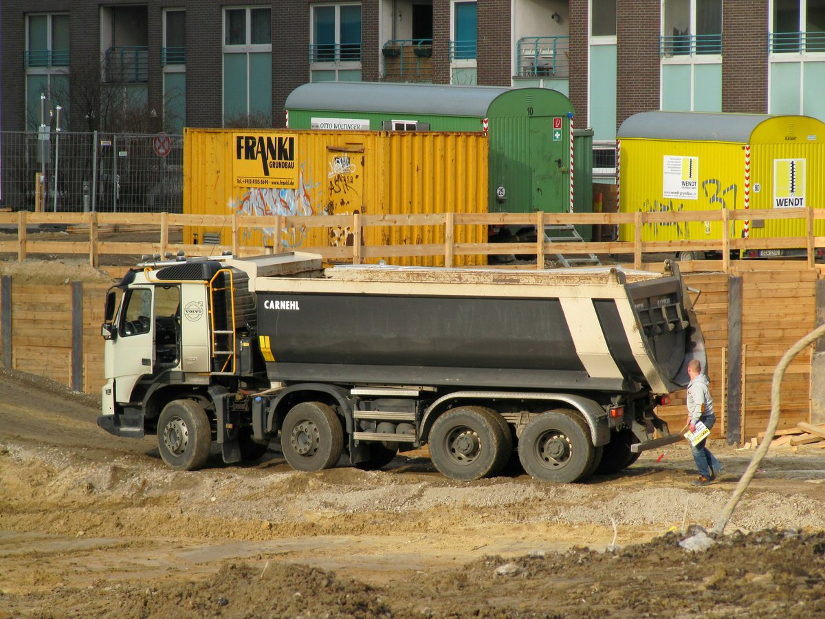 Volvo FM Vierachser nach dem Abkippen seiner Ladung in einer Baugrube in Berlin-Charlottenburg am 26.01.2017.