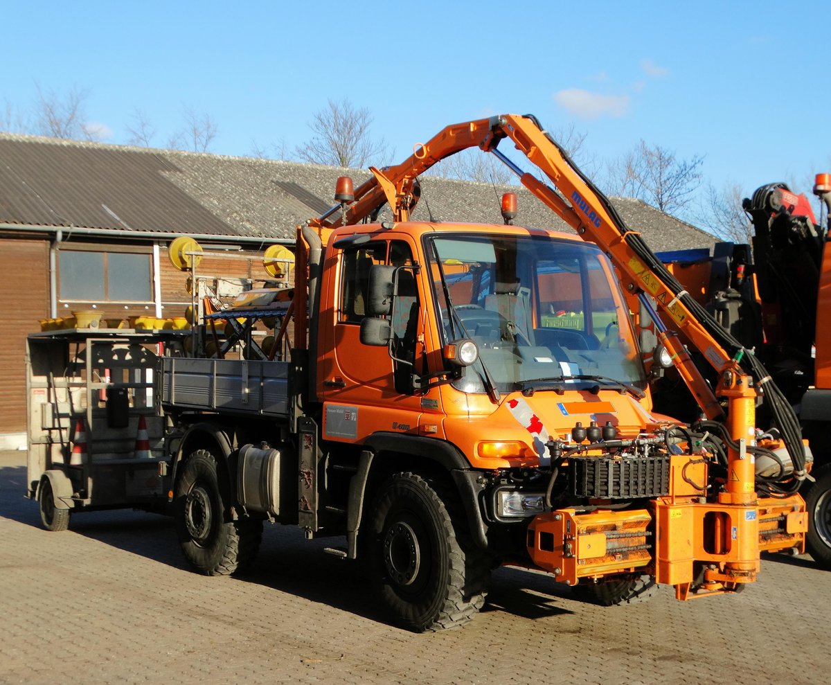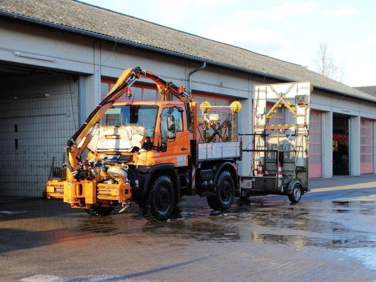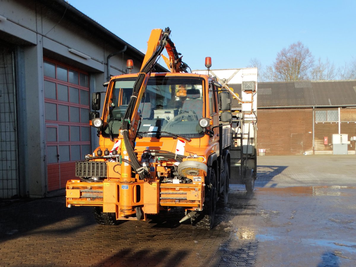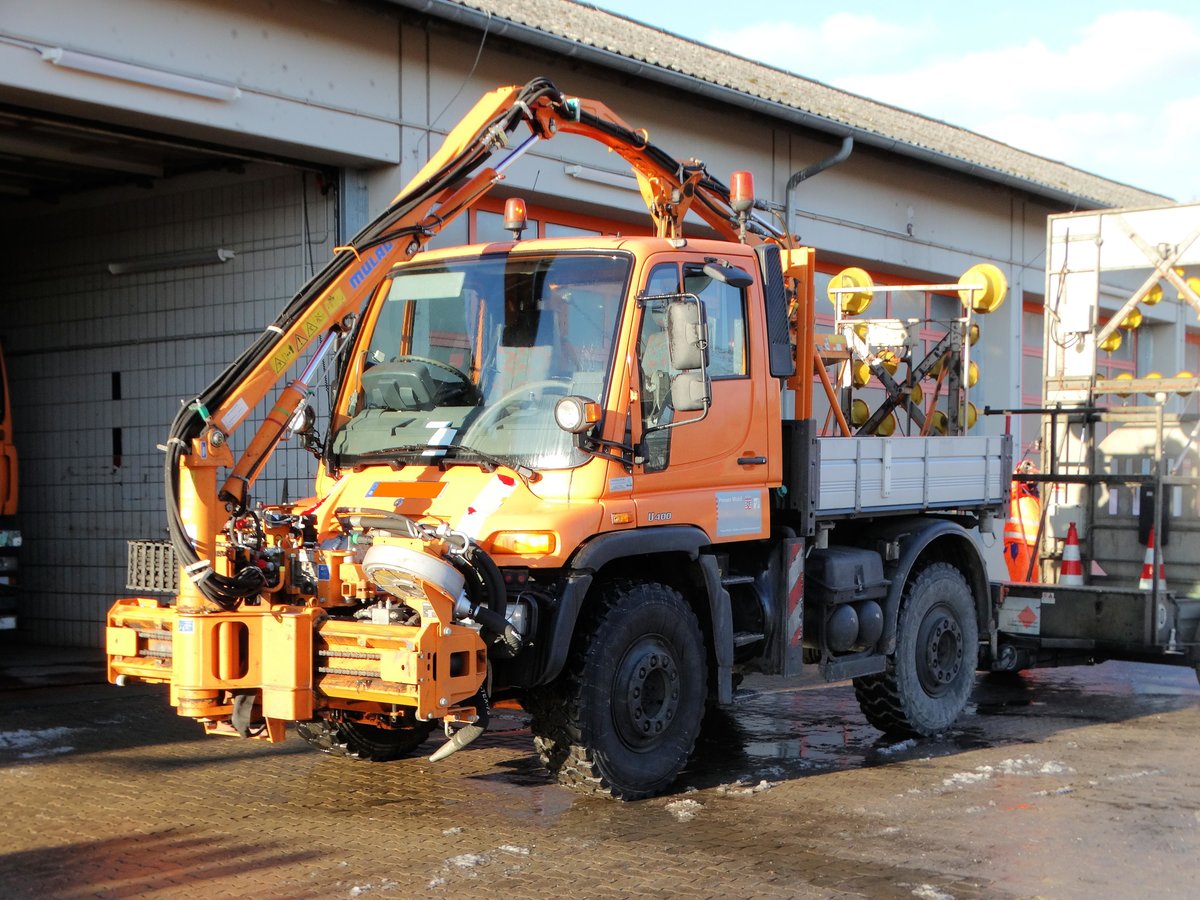 Hesssen Mobil Mercedes Benz Unimog U400 mit MULAG Schneidwerkzeug der Autobahnmeisterei Langenselbold am 06.01.17 bei einen Fototermin