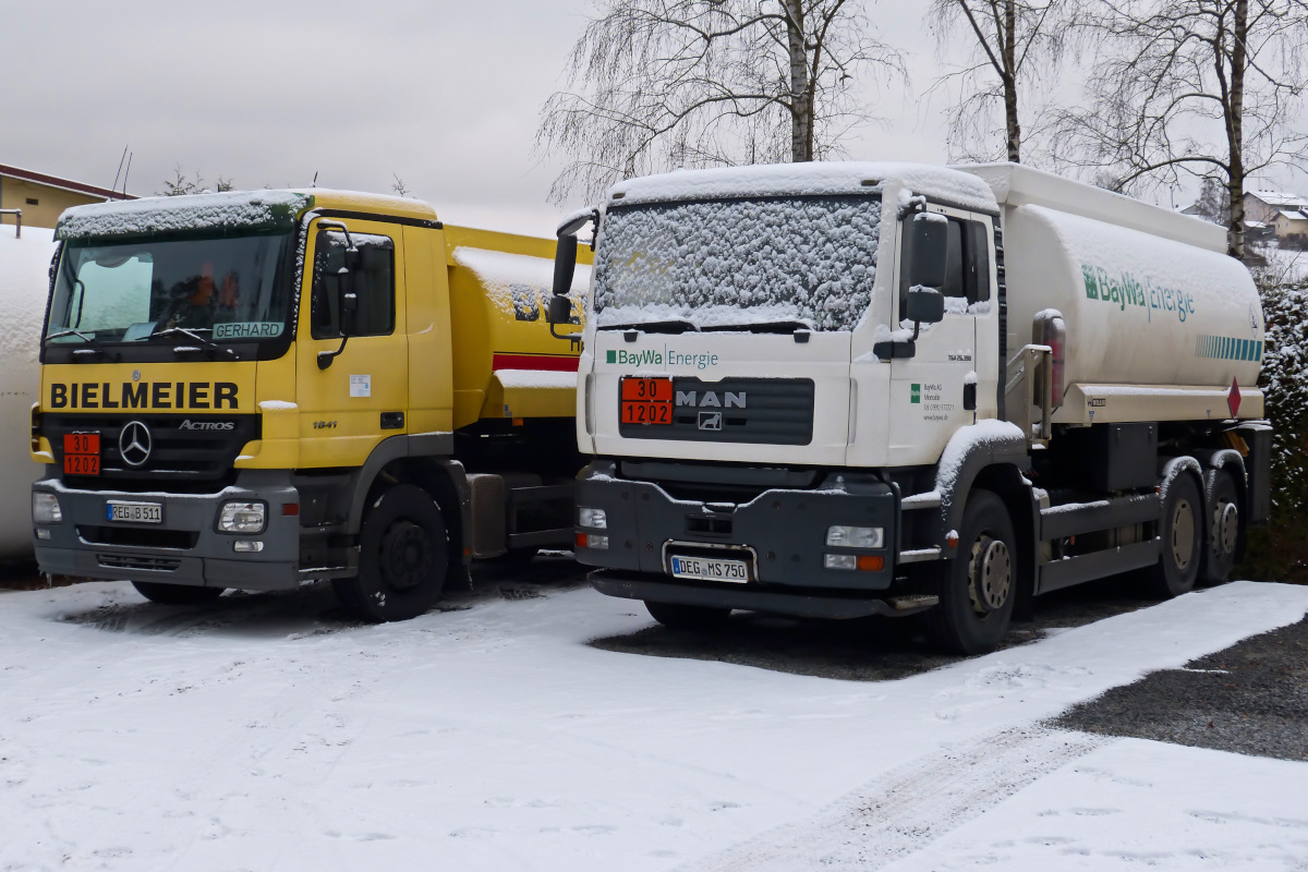 MAN TGA 26.390 und Mercedes Actros 1841 eines Heizöllieferanten in Viechtach. Fotografiert vom offenen Werkstor aus. 03.01.2016