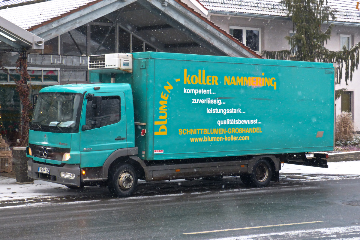 Mercedes Benz Atego 822 beliefert be dichtem Schneetreiben mit eingeschalteter Warnblinkanlage eine Gärtnerei in Viechtach. 02.01.2017