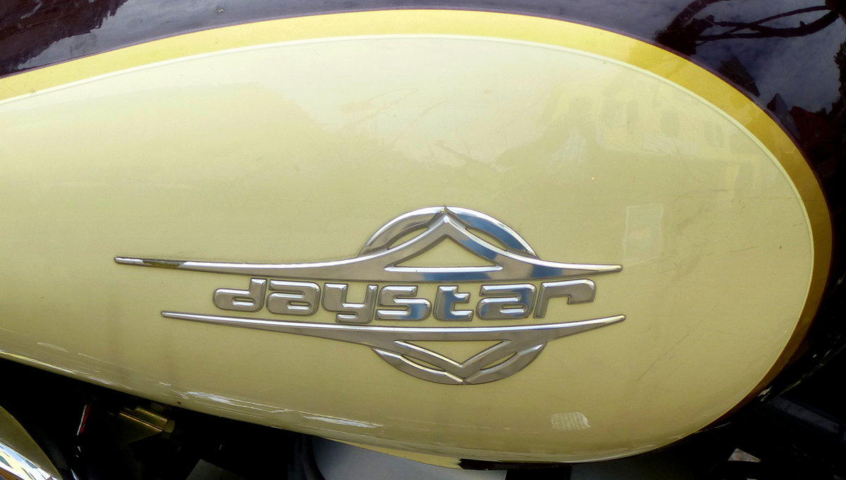 daystar, Schriftzug am Tank eines Motorrades der Firma DAELIM aus Südkorea, Juli 2017