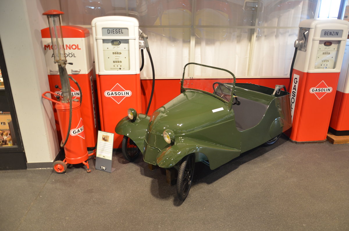 Mochet-CM Luxe, PKW Kleinwagen, Baujahr: 1950, 3 PS, und 50 kmh schnell. Im Traktormuseum Uldingen-Mülhofen am 12.06.2017