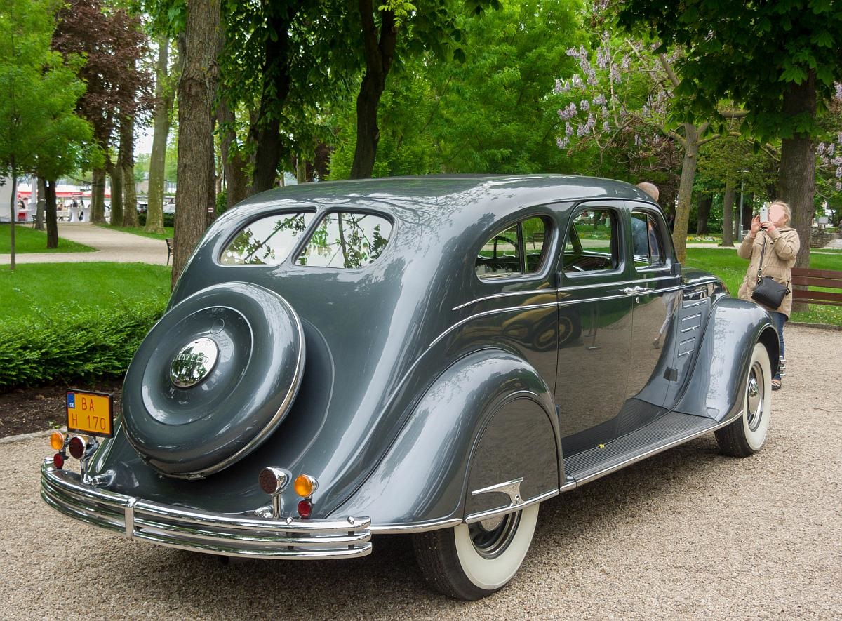 Dieser Chrysler Airflow (Rückansicht) hat den großen Preis der IV. Balatonfüred Concours d'Elegance gewonnen (Mai, 2017). Der Chrysler Airflow gehört zu den ersten aerodynamischen Autos (Stromlinienfahrzeug). Hier ist der einzige in Europa existierende Stück zu sehen.