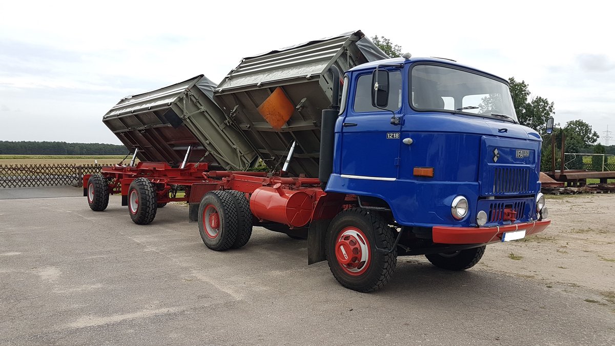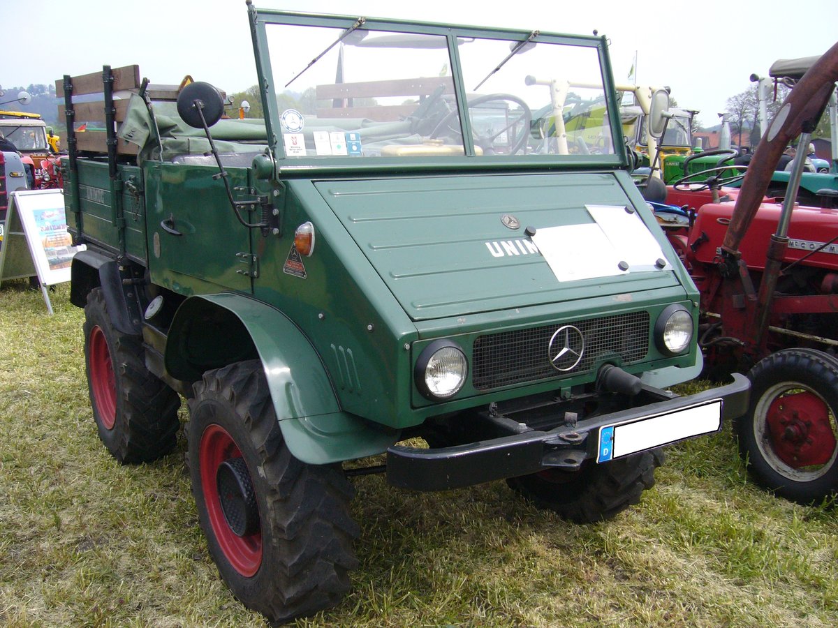 Mercedes Benz Unimog 411 aus dem Modelljahr 1963. Der OM636 genannte 4-Zylinderdieselmotor hat einen Hubraum von 1755 cm³ und leistet 32 PS. Die Höchstgeschwindigkeit dieses Arbeitsgerätes liegt bei 53 km/h. Oldtimertreffen Hörstel-Riesenbeck am 01.05.2017.