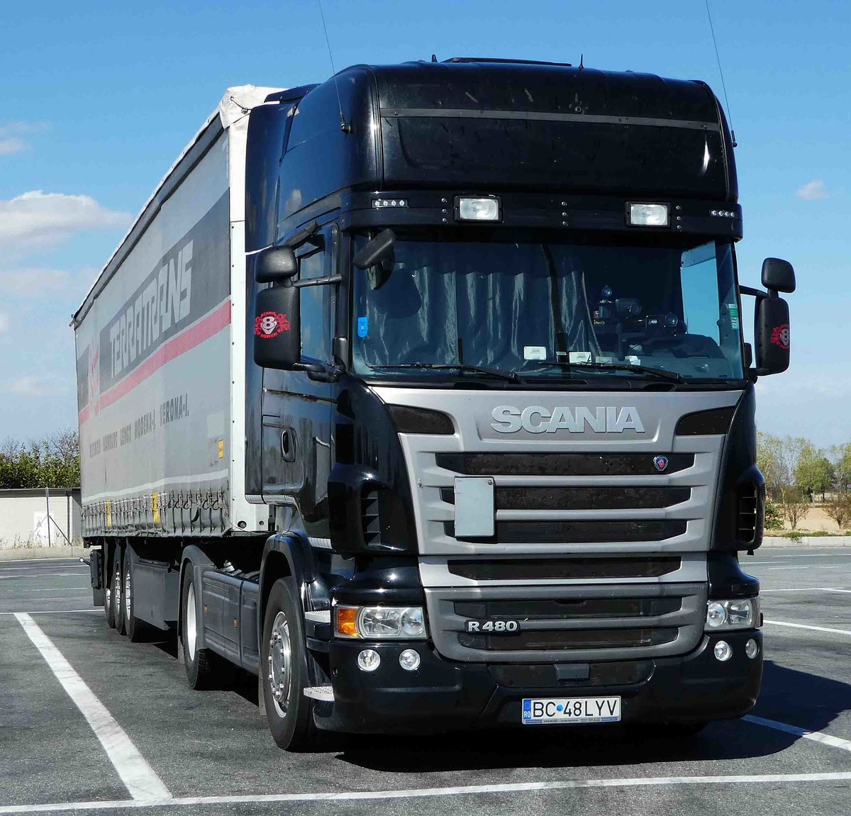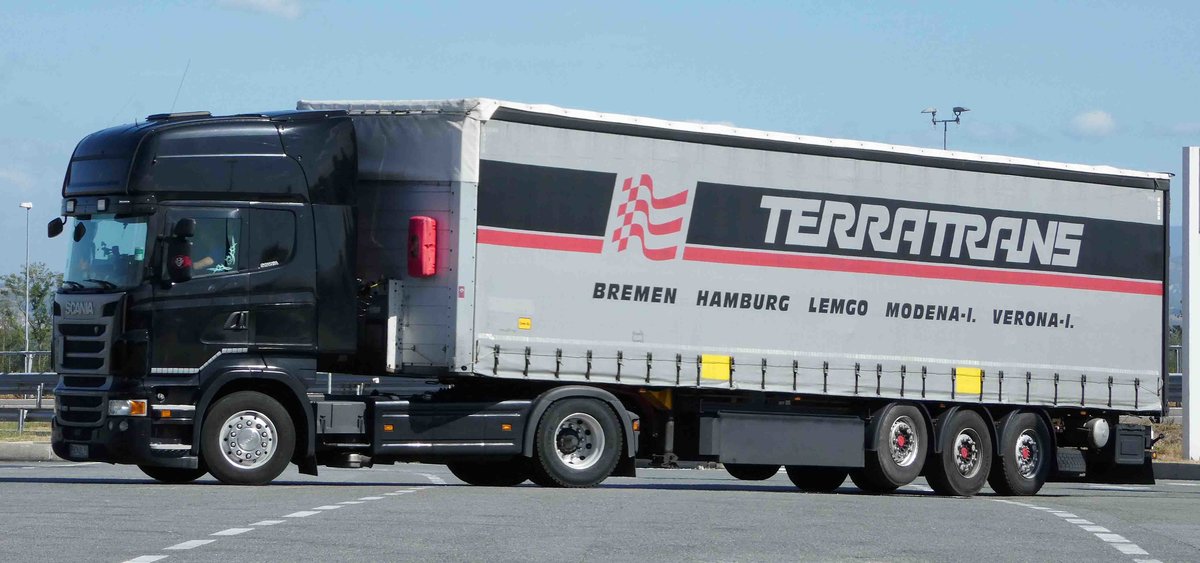 =Scania-Sattelzug R480 von TERRATRANS rangiert auf einem Rastplatz südlich von Mailand, 09-2017
