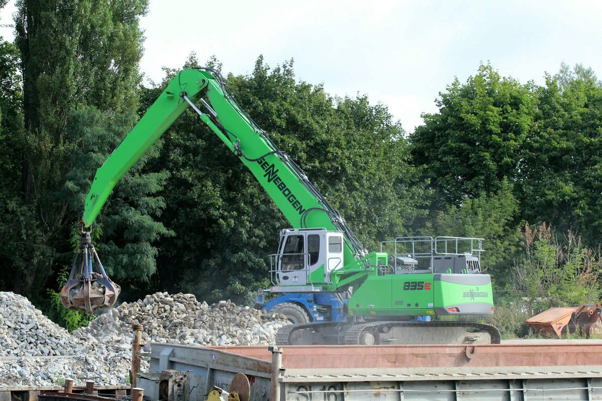 Umschlagbagger Sennebogen 835 E am 21.08.2017 am Sacrow-Paretzer-Kanal beim Verladen von Böschungsschotter.
