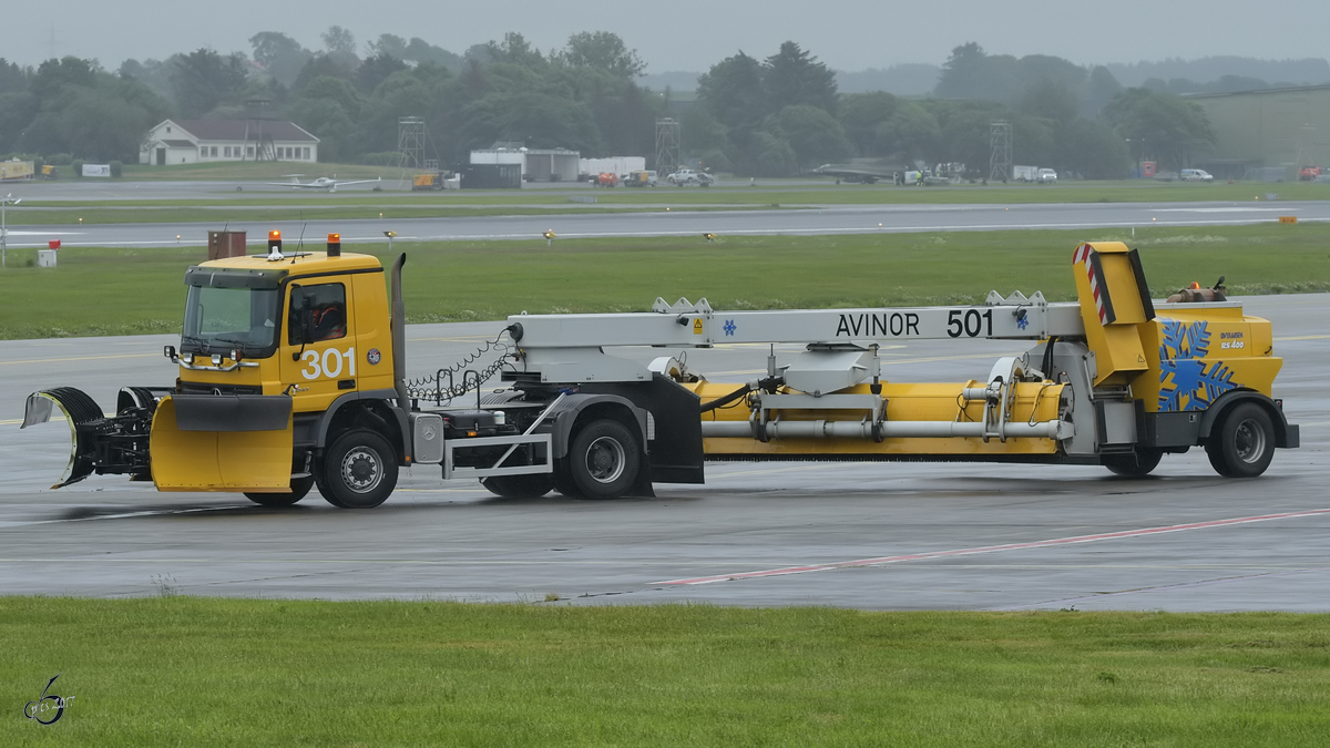 Ein Mercedes-Benz Actros 2041 mit dem Kehrblasgerät RS400 von Øveraasen auf dem Flughafen Stavanger. (Sola, Juni 2017)