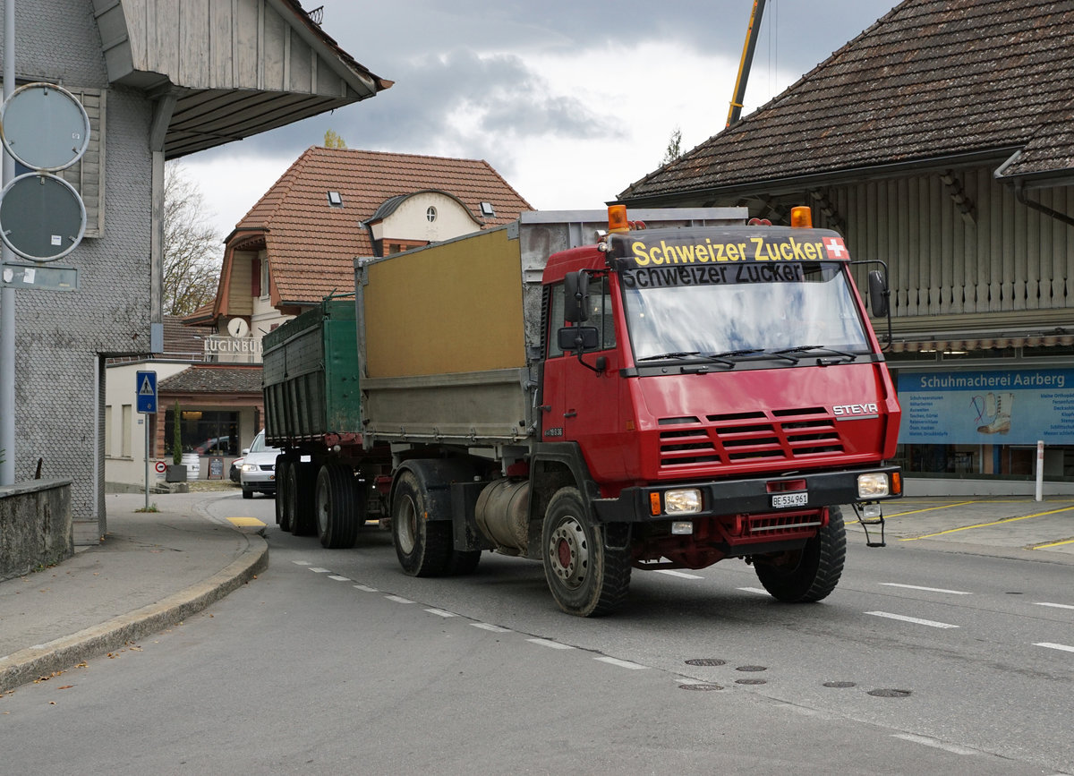 Steyr Anhängerzug bei Aarberg mit einer vollen Ladung am 27. Oktober 2017.