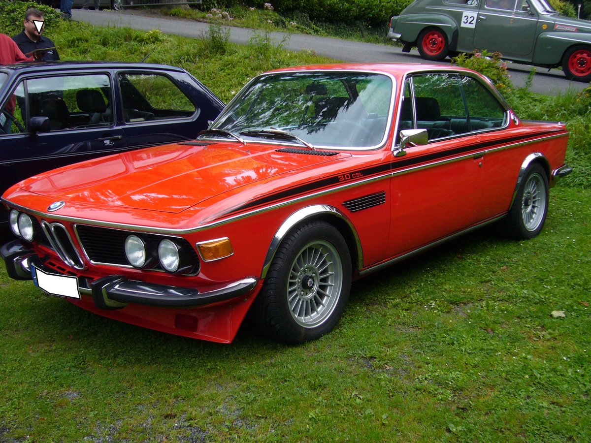 BMW E9 3.0 CSL. 1973 - 1975. Das sportlich Coupe wurde bereits 1968 als 2800 CS vorgestellt. Im Laufe der Jahre wurden ständig neue Motorisierungsvarianten ins Verkaufsprogramm aufgenommen. Der 3.0 CSL war in den letzten drei Produktionsjahren dieser Modellreihe das Spitzenprodukt. Der 6-Zylinderreihenmotor hat einen Hubraum von 3153 cm³ und leistet 206 PS. Die Höchstgeschwindigkeit beträgt 220 km/h.