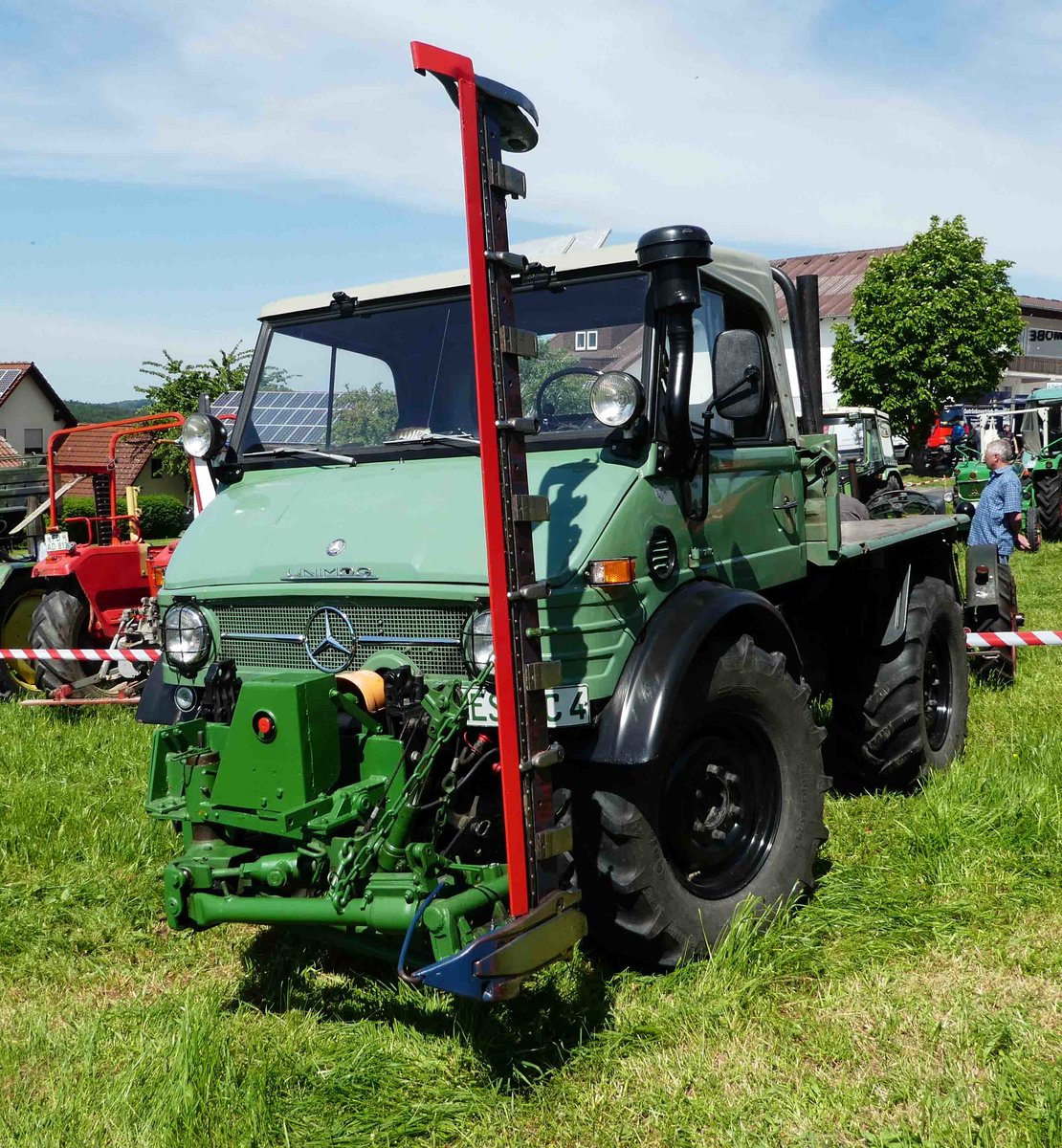 Unimog mit Vorbaumähwerk, steht bei der Oldtimerausstellung in Thalau im Mai 2017