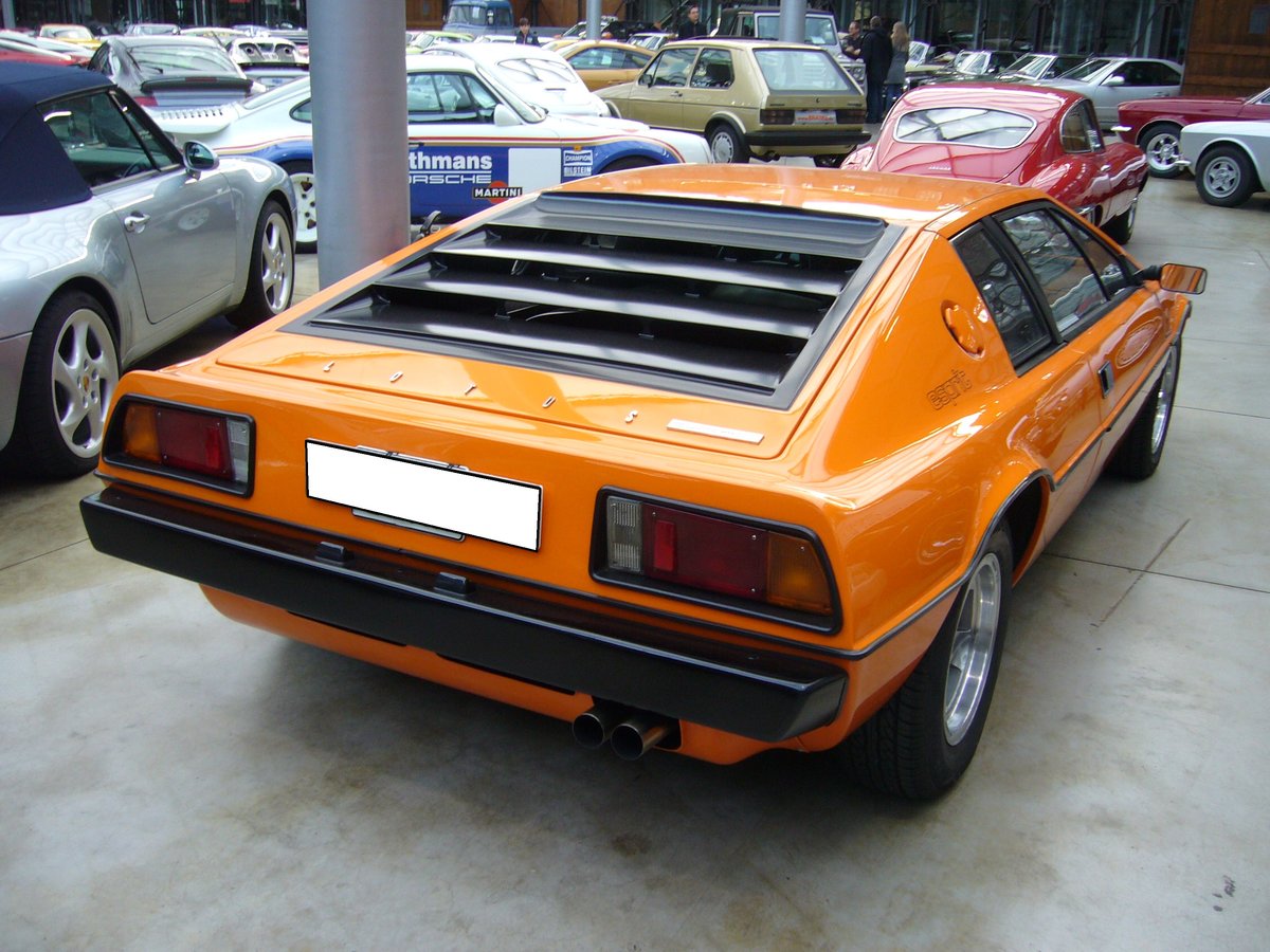 Heckansicht eines Lotus Esprit der ersten Serie, gebaut von 1976 bis 1978. Classic Remise Düsseldorf am 30.12.2018.