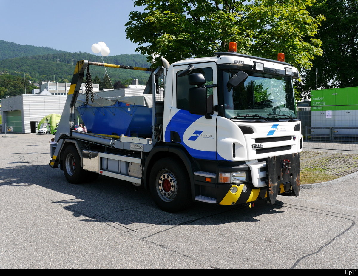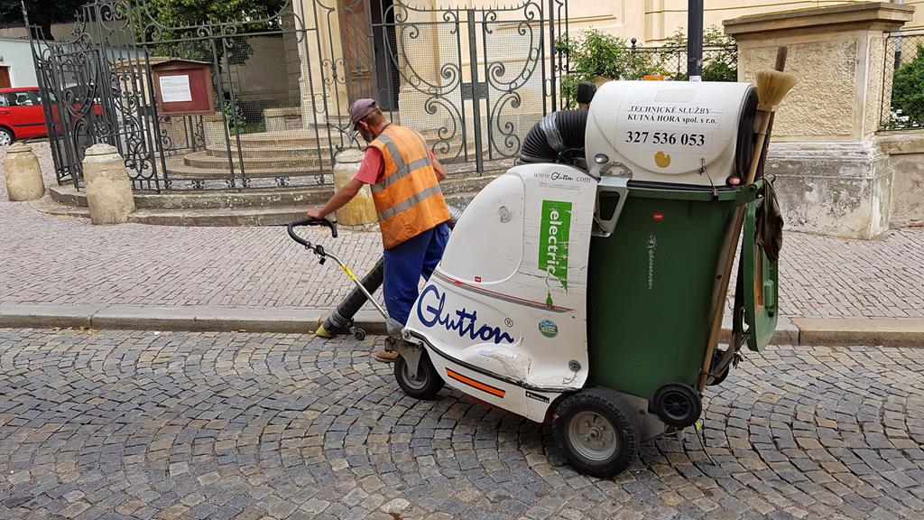 Ein motorisierter selbstfahrender Straßen Staubsauger, der mit einer Handgabel geführt wird. Der aufgenommene Schmutz wird direkt in eine Mülltonne geblasen, welche schnell gewechselt werden kann. Gesehen am 20.6.2018 in der Altstadt von Kutna Hora.