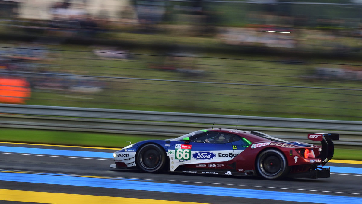 Mitzieher am Abend des 16.Juni 2018. Ford GT LMGTE Pro Nr.66, Ford Chip Ganassi Racing, Fahrer: Stefan Mücke, Olivier Pla & Billy Johnson. Platz 21. in der Gesamtwertung mit 340 Runden. Samstag Abend der 16.Juni 2018, 86. 24-Stunden-Rennen von Le Mans